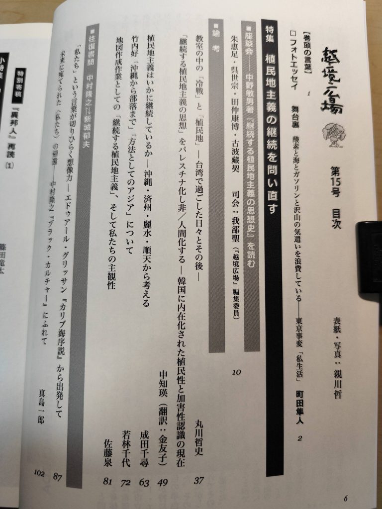呉世宗教授が参加した座談会(「座談会――中野敏男著『継続する植民地主義の思想史』を読む)と新城郁夫教授と中村隆之早稲田大教授の往復書簡(「「私たち」という言葉が切りひらく想像力――エドゥアール・グリッサン『カリブ海序説』から出発して」)が掲載されています。